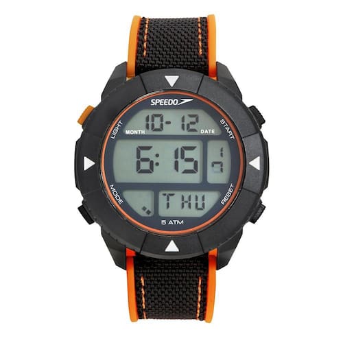 Características: com caixa em Policarbonato Preta e pulseira em Silicone Laranja com detalhe em nylon preto