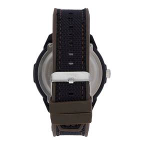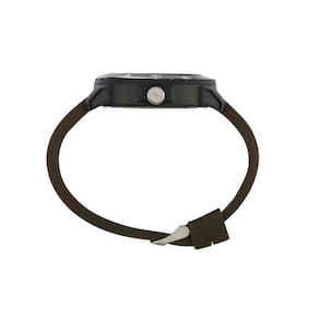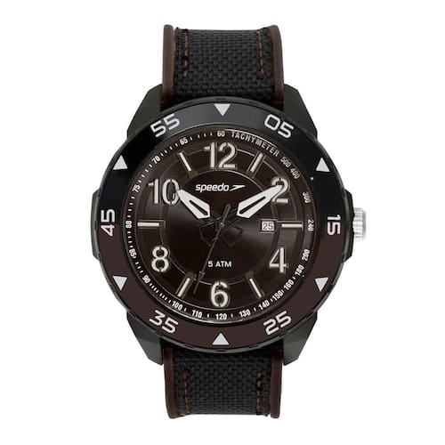 Características: com caixa em Policarbonato Preto e pulseira em Silicone Marrom com detalhe em tecido Preto