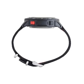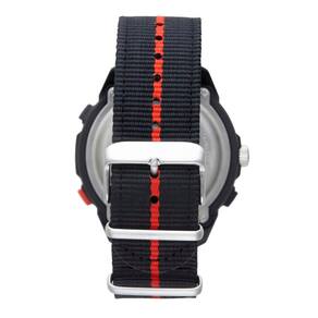 Características: com caixa em Policarbonato Preta e pulseira em tecido preto/vermelho