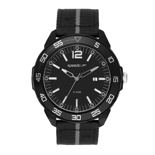 Características: com caixa em Policarbonato Preta e pulseira em tecido Preto/Cinza