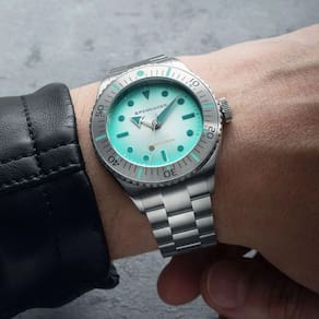 Relógio Spinnaker Spence 300 Automatic Aquamarine SP-5097-AA O Spence 300 é um relógio notável. Não em peso, não em tamanho, mas na precisão absoluta de sua engenharia. O design cuidadosamente considerado e o acabamento montado à mão resultam em um relógio com apenas 10,9 mm de espessura, mas capaz de resistir a mais de 300 m de resistência à água. Cuidadosamente considerado e engenhosamente projetado, o Spence reúne proporções, desempenho e precisão para o que consideramos um dos melhores relógios de mergulho sempre vestíveis da atualidade. Com uma espessura de caixa líder do setor de 10,9 mm contra 300 metros de resistência à água, o Spence está pronto para causar um impacto sem esforço, mas com força. Especificações Técnicas Mecanismo: Japão Miyota 9039 Automático Material da caixa: Aço Inoxidável Diâmetro da Caixa: 40mm Expessura da Caixa: 10.9mm Lug to Lug: 48mm Lente: Lente de safira com revestimento anti-reflexo Moldura: moldura unidirecional com placa de alumínio verde Cor do Mostrador: Azul Pulseira: pulseira de aço inoxidável de 20 mm com fivela dobrável e botão Faixa Extra: pulseira de borracha bege de 20 mm Funções: aro rotativo unidirecional, calendário duplo Resistência à água: 300m : Internacional de 2 anos. Marca: Não Informado