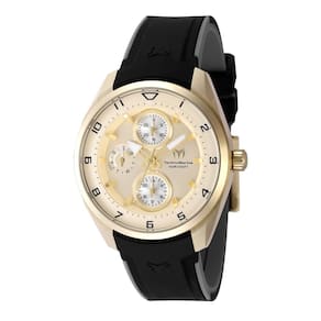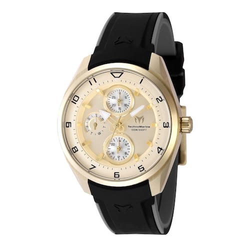 Mostrador dourado aprimorado por ponteiros dourados. Caixa em aço inoxidável dourado com uma pulseira de silicone cinza e preta. Movimento de quartzo. Resistência à água de 100 metros/330 pés. Moldura fixa. Cristal mineral. Fundo de caixa sólido. Fecho de fivela. Puxe/empurre a coroa. Tamanho da caixa 36 mm x 10,25 mm. Banda de 18 mm x 7,25 polegadas de comprimento. Relógio de oceano Technomarine TM-318114.