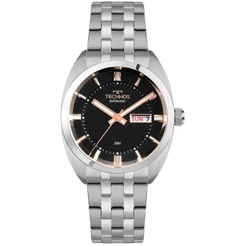 Mecanismo: Automático - Miyota com 21 Jewels - Reserva de marcha de 42h. Gênero: Masculino Visor: Preto Vidro: Cristal Mineral Funções: Calendário day-date, case back transparente Prova d'água: 50m Características: Com caixa e pulseira em aço inoxidável Diâmetro da caixa: 40 mm Garantia: 1 ano pelo fabricante Technos