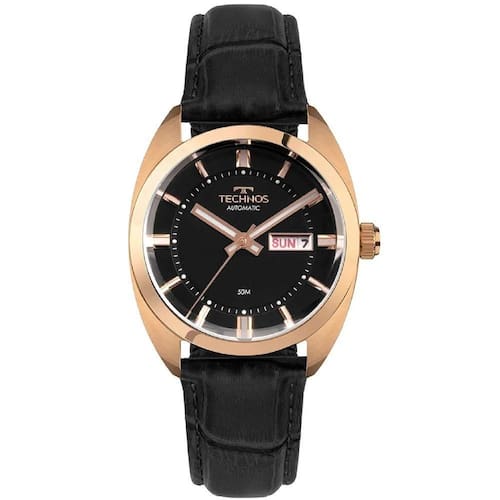 Mecanismo: Automático - Miyota com 21 Jewels - Reserva de marcha de 42h. Gênero: Masculino Visor: Preto Vidro: Cristal Mineral Funções: Calendário day-date, case back transparente Prova d'água: 50m Características: Com caixa e pulseira em couro Diâmetro da caixa: 40 mm Garantia: 1 ano pelo fabricante Technos
