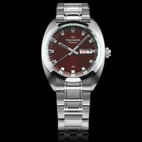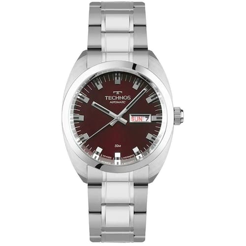 Mecanismo: Automático - Miyota com 21 Jewels - Reserva de marcha de 42h. Gênero: Masculino Visor: Vermelho Vidro: Cristal Mineral Funções: Calendário day-date, case back transparente Prova d'água: 50m Características: Com caixa e pulseira em aço inoxidável Diâmetro da caixa: 40 mm Garantia: 1 ano pelo fabricante Technos