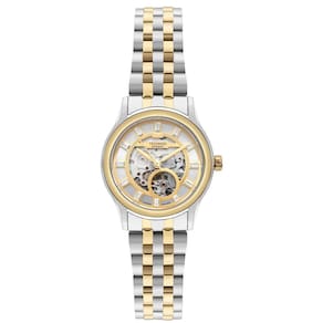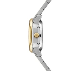 O acabamento bicolor em aço inoxidável confere elegância e versatilidade, enquanto o aro com acabamento abaulado dourado adiciona um toque refinado ao visual. Os marcadores de hora com aplicação elevam o brilho do mostrador, tornando o relógio ainda mais sofisticado. O fundo rosqueado em vidro permite a visualização do mecanismo também pela parte traseira, reforçando o conceito premium da peça.