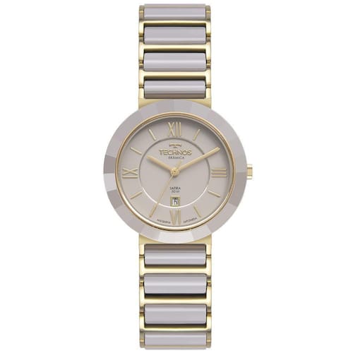 Relógio technos ceramic com a elegante numeração romana nos marcadores de hora, assinatura de linha no mostrador e aro externo com acabamento facetado. Seu diferencial está nos materiais utilizados em sua composição: feito em aço inoxidável em banho dourado, ele apresenta aplicação de cerâmica bege na pulseira e no aro externo da caixa, além de possuir vidro de safira, ambos altamente resistentes a riscos e arranhões. Produto com máquina quartz japonesa miyota, calendário e resistência à água de 50m. Tamanho de caixa 34mm.Especificações do produtoBanho: douradoTipo: analógicoCor da caixa: douradoMaterial da pulseira: cerâmicaFormato: redondoCor do mostrador: cinzaCor da pulseira: douradoLargura da caixa cm : 3,4Resistência à água 5 atm