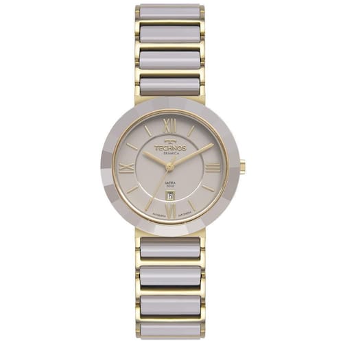 Relógio technos ceramic com a elegante numeração romana nos marcadores de hora, assinatura de linha no mostrador e aro externo com acabamento facetado. Seu diferencial está nos materiais utilizados em sua composição: feito em aço inoxidável em banho dourado, ele apresenta aplicação de cerâmica bege na pulseira e no aro externo da caixa, além de possuir vidro de safira, ambos altamente resistentes a riscos e arranhões. Produto com máquina quartz japonesa miyota, calendário e resistência à água de 50m. Tamanho de caixa 34mm.