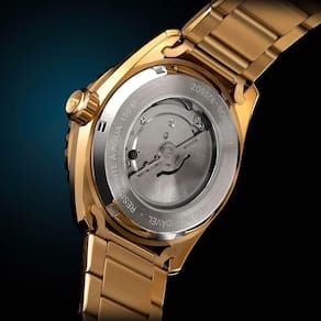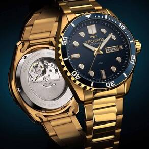 Relógio Technos Automático Diver apresenta o clássico design de mergulho, inspirado nos modelos lançados pela Technos na década de 70, que fizeram história no . Ele conta com a precisão do maquinismo automático japonês Miyota, com 21 jewels e reserva de marcha de 42 horas, além da presença do calendário day-date e fundo de vidro rosqueado, que permite a visualização do movimento mecânico das engrenagens. O modelo também apresenta elementos fundamentais para aventuras submersas, como o aro externo giratório unidirecional com acabamento corrugado e mostrador na cor preto com efeito luminescente nos ponteiros e marcadores de hora, além dos marcadores de hora em formas geométricas, fator que facilita a leitura das horas. Seu sistema de impermeabilização é configurado pela tripla vedação na coroa e botões de acionamento, além da coroa ser rosqueada para oferecer ainda mais ao mergulhar. Produto 100% em aço inoxidável, banhado em dourado, com maquinismo automático japonês Miyota, tamanho de caixa 43mm e resistência à água de 150 metros. Acompanha estojo especial.