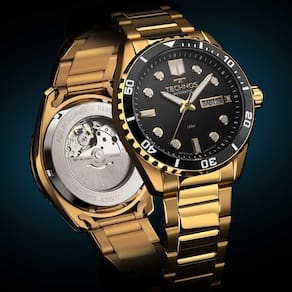 Relógio Technos Automático Diver apresenta o clássico design de mergulho, inspirado nos modelos lançados pela Technos na década de 70, que fizeram história no . Ele conta com a precisão do maquinismo automático japonês Miyota, com 21 jewels e reserva de marcha de 42 horas, além da presença do calendário day-date e fundo de vidro rosqueado, que permite a visualização do movimento mecânico das engrenagens. O modelo também apresenta elementos fundamentais para aventuras submersas, como o aro externo giratório unidirecional com acabamento corrugado e mostrador na cor preto com efeito luminescente nos ponteiros e marcadores de hora, além dos marcadores de hora em formas geométricas, fator que facilita a leitura das horas. Seu sistema de impermeabilização é configurado pela tripla vedação na coroa e botões de acionamento, além da coroa ser rosqueada para oferecer ainda mais ao mergulhar. Produto 100% em aço inoxidável, banhado em dourado, com maquinismo automático japonês Miyota, tamanho de caixa 43mm e resistência à água de 150 metros. Acompanha estojo especial.