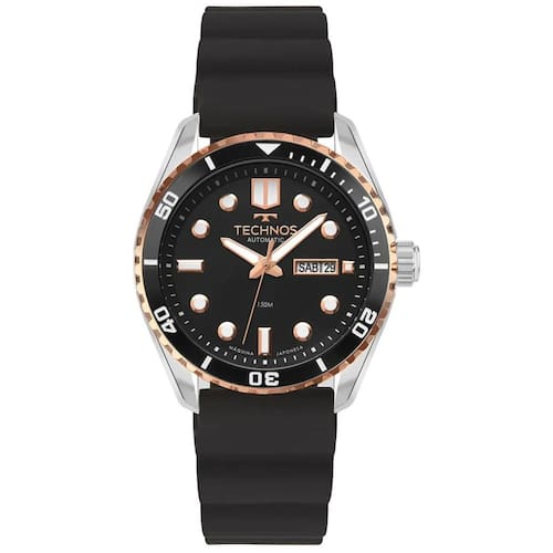 Relógio Technos Masculino Automático Bicolor - 8205PB/2P Relógio Automático Diver apresenta o clássico design de mergulho, inspirado nos modelos lançados pela Technos na década de 70, que fizeram história no Brasil. Ele conta com a precisão do maquinismo automático japonês Miyota, com 21 jewels e reserva de marcha de 42 horas, além da presença do calendário day-date e fundo de vidro rosqueado, que permite a visualização do movimento mecânico das engrenagens. O modelo também apresenta elementos fundamentais para aventuras submersas, como o aro externo giratório unidirecional com acabamento corrugado, pulseira de silicone e mostrador na cor preto com efeito luminescente nos ponteiros e marcadores de hora, além dos marcadores de hora em formas geométricas, fator que facilita a leitura das horas. Seu sistema de impermeabilização é configurado pela tripla vedação na coroa e botões de acionamento, além da coroa ser rosqueada para oferecer ainda mais segurança ao mergulhar. Produto 100% em aço inoxidável, com maquinismo automático japonês Miyota, tamanho de caixa 43mm e resistência à água de 150 metros. Acompanha estojo especial. Marca: Não Informado