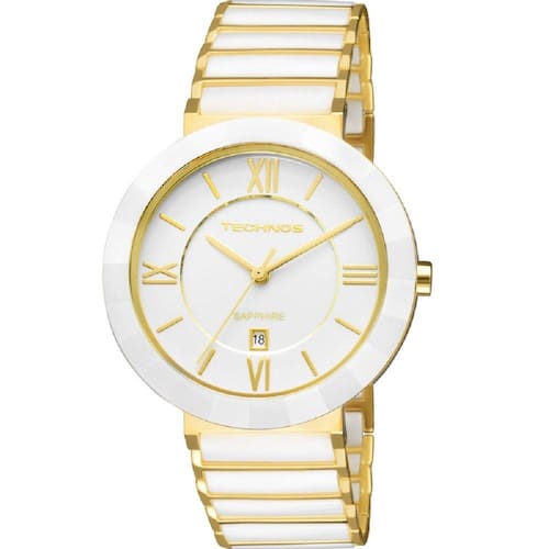 Relógio Technos Elegance Ceramic Sapphire - 2015CE/4B Caixa Em Aco; Coroa Estampada Com Logomarca Technos; Pulseira Em Cerâmica Branca Com Filete Dourado Ao Redor De Cada Elo; Analógico; Datador; Ponteiro Dourado; Cor Índex: Dourado; Resistência A Água: 50 Metros (5 Atm) Tipo De Vidro: Safira;