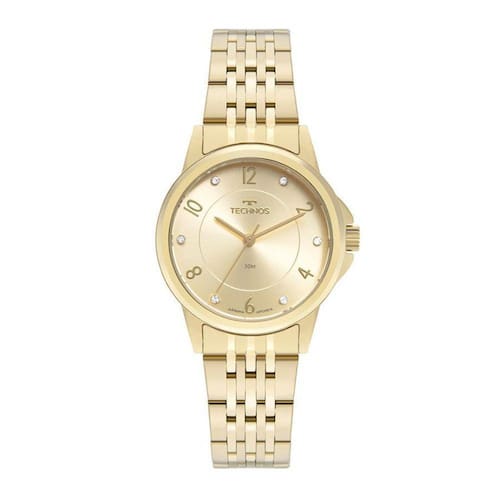 Descrição do Produto: Caixa de Aço Inox Pulseira de Aço Inox Fundo de Pressão Resistente à Água 5 Atm Diâmetro / Largura da Caixa: 32.00 MM Vidro de Cristal Mineral Funções: Analógico Maquina Japonesa Alimentação do Maquinário: Bateria Mostrador Dourado com pedras e números
