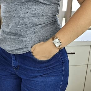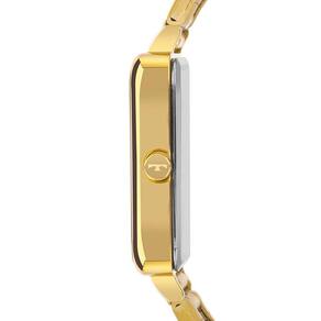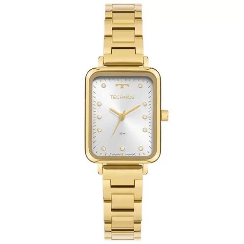 Características Formato do Relógio: Retangular Composição do Vidro: Cristal mineral Material da Caixa: Aço Inox Cor da Caixa: Dourado Cor do mostrador: Prata Material da Pulseira: Aço Inox Cor da Pulseira: Dourado Mecanismo: Analógico Quartz