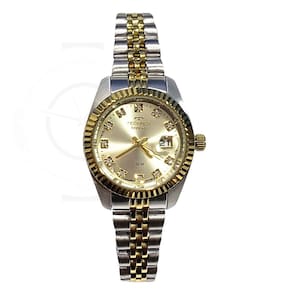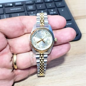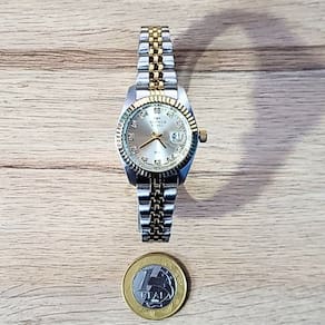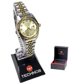 Marca: Technos Modelo: 2015CEM/1X Tipo de relógio: Analógico Gênero: Feminino Cor da caixa: Prateado Cor da pulseira: Prateado e Dourado Estilo: Casual Alarme: Não Cronômetro: Não Calendário: Sim Luz: Não Resistência à água: Sim – 5 ATM = 50 metros Tipo de fecho: Dobrável, com trava lateral Material da Caixa: Aço Inoxidável Material da Pulseira: Aço Inoxidável Características do vidro: Cristal Mineral Tamanho da caixa: 28 mm Espessura da caixa: 10 mm Comprimento da pulseira: 21 cm Largura da pulseira: 10 mm Tampa do fundo: Pressão Peso: 56 Gramas Alimentação: Bateria Garantia do Fabricante: 12 meses Fabricante: Technos da Amazônia Ind e Com S/A
