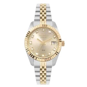 Relogio technos feminino bicolor prata e dourado 2015cem/1x relógio technos elegance riviera feminino, com caixa e pulseira de aço em banho dourado misto enaltecendo a essência dos clássicos, o modelo apresenta aro externo trabalhado com o icônico acabamento corrugado e seu vidro com lupa de calendário, ele ainda conta com aplicação de pedras cravejadas nos marcadores de hora. Produto 100% em aço inoxidável, com máquina quartz japonesa, calendário e resistência à água de 50m. Medidas diametro da caixa: 28 mm pequeno medida sem coroa diametro da caixa: 30 mm medida com coroa espessura da caixa: 10,6 mm comprimento da pulseira: 20 cm peso: 60 gramas