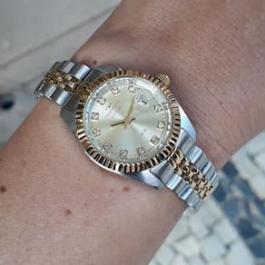 cor do aro: dourado cor da caixa: prata cor da pulseira: prata e dourado cor do mostrador: dourado material da caixa: aço inox material da pulseira: aço inox pulseira ajustável: sim strass: sim calendario: sim vidro com lupa de calendário fonte de energia: bateria vidro: cristal mineral mecanismo: analógico