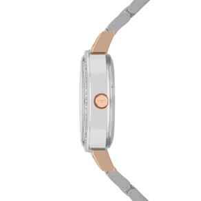Relógio Boutique apresenta um novo lançamento clássico. Apresenta aplicação de pedras no aro externo e interno, e no mostrador de fácil leitura na cor prata, que conta com numeração romana nos marcadores de hora. Produto 100% em aço inoxidável, banhado em bicolor, com máquina quartz Japonesa Miyota e resistência à água de 50 metros.