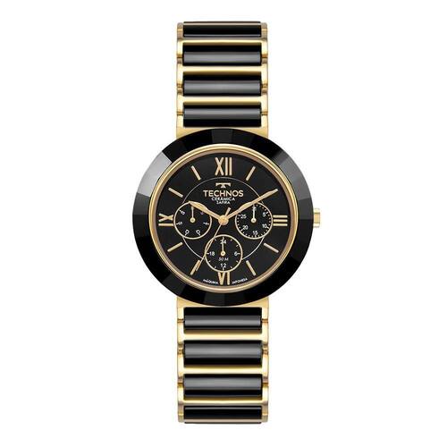 Com caixa e aro em tom dourado e pulseira em aço inoxidável com inserções de cerâmica preta, o modelo combina elegância e durabilidade. O mostrador preto com marcadores dourados e três subdials funcionais acrescenta um toque refinado e contemporâneo, ideal para mulheres que buscam estilo e exclusividade em um único acessório.