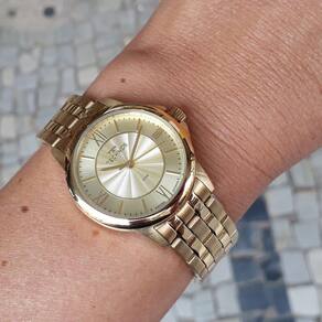 cor do aro: dourado cor da caixa: dourado cor da pulseira: dourado cor do mostrador: dourado material da caixa: aço inox material da pulseira: aço inox pulseira ajustável: sim algarismo romano: sim fonte de energia: bateria mecanismo: analógico