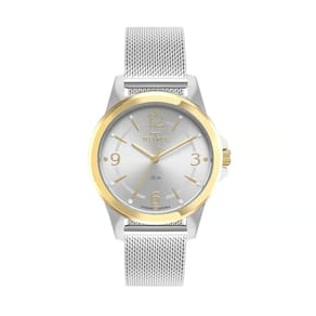 A linha Dress apresenta seu novo modelo. Ele possui um mostrador sofisticado, que contém fácil leitura e marcação de horas em números arábicos. Ele ainda possui uma elegante pulseira de aço inoxidável em mesh de fácil ajuste, disponível nos banhos dourado e prata. Produto 100% em aço inoxidável, com máquina quartz Japonesa Miyota e resistência à água de 50 metros