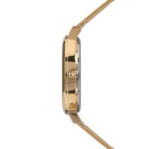 Com caixa de 36 mm em aço inoxidável dourado e mostrador champagne com acabamento escovado, o modelo apresenta uma leitura limpa com marcadores minimalistas e números sutis nas posições 12, 4 e 8. A pulseira tipo mesh (malha fina) dourada proporciona encaixe perfeito ao pulso e um visual refinado com caimento suave.
