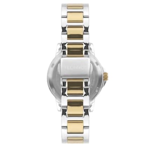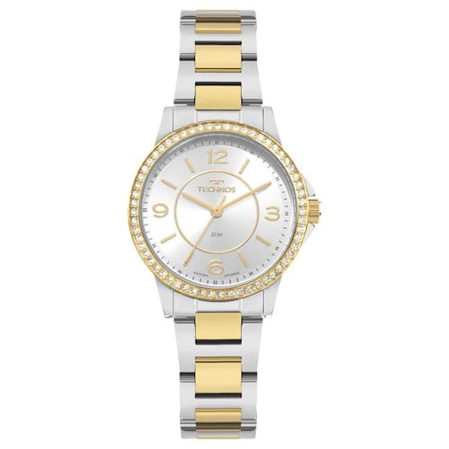 Relógio Technos Feminino Ref: 2035nch/1k Elegance Bicolor Descrição do Produto: Caixa de Aço Inox Pulseira de Aço Inox Fundo Rosqueado Resistente à Água 5 Atm Diâmetro / Largura da Caixa: 32.00 MM Vidro de Cristal Mineral Funções: Analógico Maquina Japonesa Alimentação do Maquinário: Bateria Mostrador Prateado com números Aro Externo de pedras Prateado com Dourado de 1 Ano
