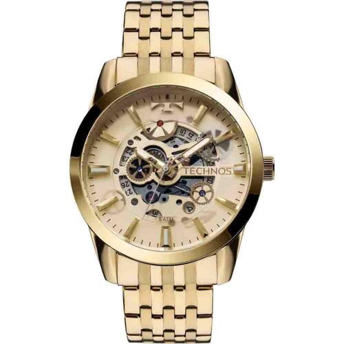 Este relógio automático possui caixa de 4,6 cm e se destaca pelo seu mostrador vazado, que permite enxergar o maquinismo por diversos ângulos. Além disso, o modelo possui fundo transparente, caixa e pulseira de aço dourado e calendário. Resistência à água até 50 m.