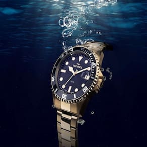 A linha Acqua apresenta seu novo modelo, com o clássico design para mergulho. Ele possui elementos indispensáveis para aventuras submersas, como o aro externo giratório com acabamento corrugado e lente antireflexo com lupa de calendário, além do mostrador com ponteiros e marcadores de hora luminescentes. Seu mostrador ainda conta com um acabamento degradê colorido e formas geométricas nos marcadores de hora. Produto 100% em aço inoxidável, com máquina quartz japonesa Miyota, calendário e resistência à água de até 150 metros