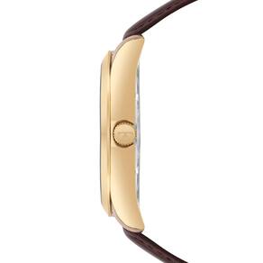 Características Formato do Relógio: Redondo Composição do Vidro: Cristal mineral Material da Caixa: Aço Inox Cor da Caixa: Dourado Cor do mostrador: Azul Material da Pulseira: Couro Cor da Pulseira: Marrom Mecanismo: Analógico Quartz