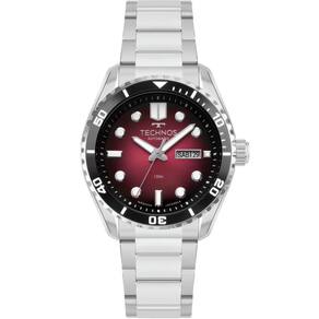 Relógio Masculino TECHNOS Automático Acqua Referência TECHNOS do Brasil 8205PA/1R Máquina com movimento automático / mecânico Mecanismo Automático com 3 ponteiros Caixa do relógio em aço inoxidável prateado Pulseira de aço inoxidável prateado Fecho com trava para abertura Mostrador vermelho/vinho Coroa simples padrão sem rosca Tampa posterior rosqueada com vidro de cristal e mecanismo aparente Resistência à água 15ATM 150M Ean: 7891530878060