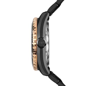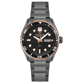 Relógio Automático Diver apresenta o clássico design de mergulho, inspirado nos modelos lançados pela Technos na década de 70, que fizeram história no Brasil. Ele conta com a precisão do maquinismo automático japonês Miyota, com 21 jewels e reserva de marcha de 42 horas, além da presença do calendário day-date e fundo de vidro rosqueado, que permite a visualização do movimento mecânico das engrenagens. O modelo também apresenta elementos fundamentais para aventuras submersas, como o aro externo giratório unidirecional com acabamento corrugado e mostrador na cor preto com efeito luminescente nos ponteiros e marcadores de hora, além dos marcadores de hora em formas geométricas, fator que facilita a leitura das horas. Seu sistema de impermeabilização é configurado pela tripla vedação na coroa e botões de acionamento, além da coroa ser rosqueada para oferecer ainda mais segurança ao mergulhar. Produto 100% em aço inoxidável, banhado em grafite, com maquinismo automático japonês Miyota, tamanho de caixa 43mm e resistência à água de 150 metros.