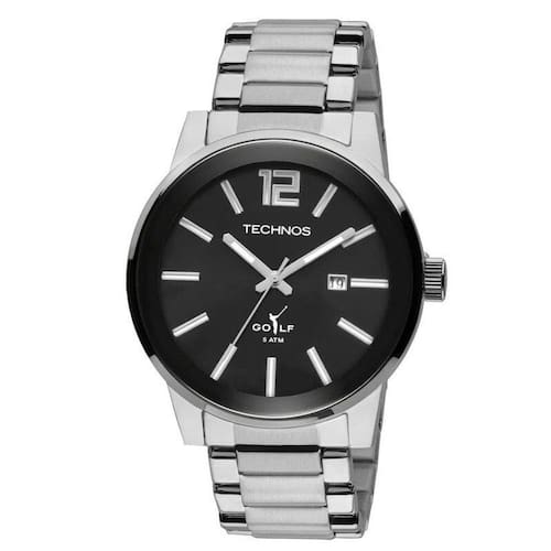 relógio technos golf masculino com caixa e pulseira de aço prata. O design clássico com mostrador e aro preto é a característica mais marcante desse relógio. Especificações: