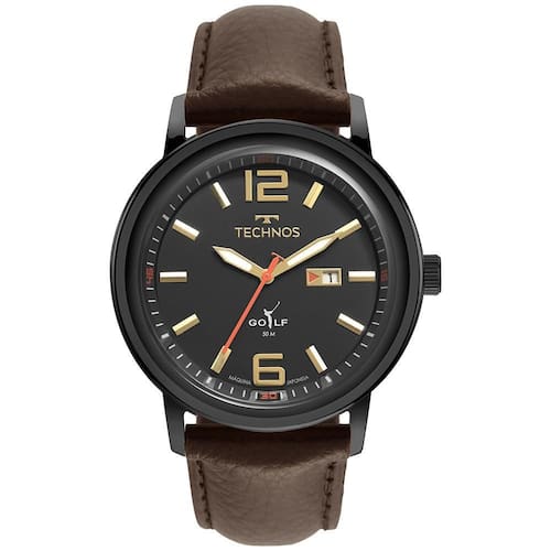 Relógio Technos Golf com design atemporal, lente abaulada e assinatura de linha diferenciada. Seu mostrador conta com numeração arábica nas posições de 6 e 12 horas, além do aro interno com marcação de minutos. Produto 100% em aço inoxidável, com pulseira de couro , máquina quartz japonesa Miyota, calendário e resistência à água de 50 metros.