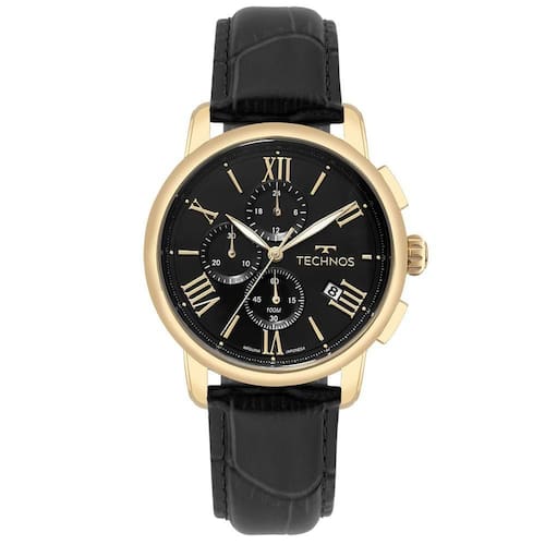 Relógio Technos Masculino Grandtech Dourado Js15enx/0p Relógio Technos Grandtech apresenta seu modelo, de design clássico e pulseira de couro na cor preta. Além disso, o relógio conta com mostrador trabalhado, numeração romana, cronógrafo e calendário na posição de 4 horas. Produto em aço inoxidável, com resistência à água de 100 metros. Banho Dourado Tipo Multifunção Cor da Caixa Dourado Material da Pulseira Couro Material da Caixa Aço Formato Redondo Cor do Mostrador Preto Tipo de Fecho Fivela Garantia 12 meses Cor da Pulseira Preto Largura da Caixa (cm) 4,4 Resistência à Água 10 ATM Cor Dourado Tamanho Grande Gênero Masculino