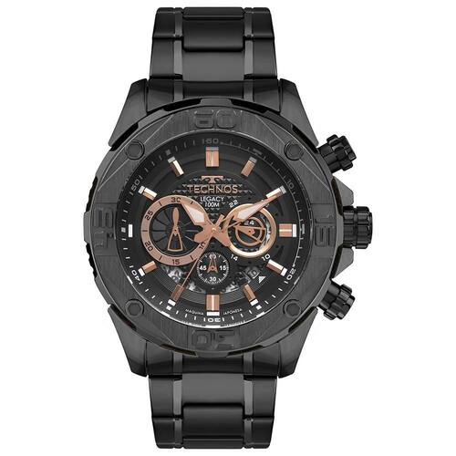 Relógio Technos Legacy com aro externo trabalhado em relevos e detalhes de parafuso. Sua caixa robusta conta com a aplicação de silicone em relevos nas laterais. Seu mostrador apresenta duas camadas, efeito de profundidade, aplicação de textura e assinatura de linha. Produto 100% em aço inoxidável, com máquina quartz japonesa Miyota, cronógrafo, calendário e resistência à água de 100 metros
