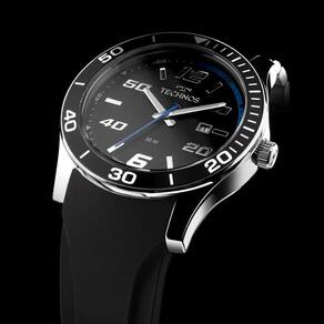 Relógio Technos Racer que apresenta um design esportivo e aro externo de alumínio, com marcações dos minutos/segundos. Seu mostrador na cor preta possui aplicação de textura, números grandes e toques de azul. Produto 100% em aço inoxidável, com pulseira de silicone na cor preta, máquina quartz Japonesa Miyota, calendário e resistência à água de 50 metros. Tamanho de caixa 46mm