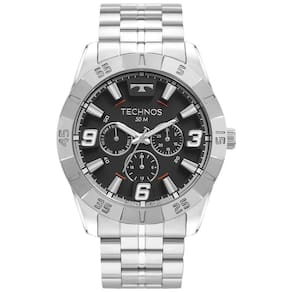 meli_title - Relógio Technos Racer masculino com caixa e pulseira de aço. Com um design esportivo, inspirado no universo automobilístico, o modelo apresenta aro externo trabalhado com relevos, além do mostrador preto texturizado com efeito de profundidade, números grandes e detalhes em vermelho. Produto 100% em aço inoxidável, com máquina quartz japonesa multifunção e resistência à água de 50m.