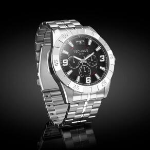 Relógio Technos Racer masculino com caixa e pulseira de aço. Com um design esportivo, inspirado no universo automobilístico, o modelo apresenta aro externo trabalhado com relevos, além do mostrador preto texturizado com efeito de profundidade, números grandes e detalhes em vermelho. Produto 100% em aço inoxidável, com máquina quartz japonesa multifunção e resistência à água de 50m.