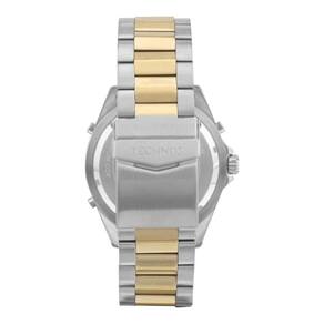 Sua caixa de 48mm em aço apresenta acabamento bicolor, que une os tons prata e dourado, conferindo personalidade e sofisticação ao conjunto. O mostrador preto traz leitura clara e objetiva, com combinação analógico-digital que facilita o acesso às funções e reforça o caráter esportivo do modelo. O aro giratório com marcações contribui para o visual técnico e funcional.