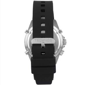 Relógio Technos Skydiver Pilot masculino, com caixa de aço prata, pulseira de silicone preta e mostrador hiper detalhado, com ponteiro dos segundos em vermelho. Ele apresenta aro interno giratório, maquinismo anadigi exclusivo da marca, display digital inconfundível em forma de "sorriso" e clássica presença de lumi nos ponteiros e indexes.