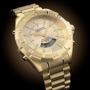 Descrição do produto:Símbolo da inovação relojoeira desde 1985, o novo modelo Skydiver icônico da Technos apresenta aro giratório com marcação em alto relevo, display digital e clássica presença de lumi no mostrador. Produto 100% em aço inoxidável em banho dourado, com resistência à água de 150m. Especificações técnicas:Tipo: Analógico e digitalMaterial da caixa: AçoCor da caixa: DouradoLargura da caixa: 4,8 cmCor do mostrador: DouradoMaterial da pulseira: AçoCor da pulseira: DouradoComprimento da pulseira: 23cm aprox.Tipo de fecho: Trava por pressãoResistência à água: 15 ATM 150 metros