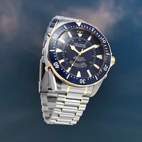 O icônico Skydiver agora em nova versão na caixa bicolor prata e dourada e aro azul giratório com aplicação de alumínio e marcação dos minutos/segundos. Ele apresenta maquinismo anadigi exclusivo da marca, com display digital LCD positivo em forma de sorriso e mostrador luminescente com assinatura de linha. Pulseira 100% aço inoxidável bicolor prata e dourada. Produto 100% em aço inoxidável, com máquina anadigi e resistência à água de 150 metros