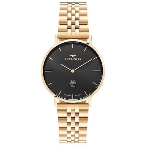 Relógio Techno Slim apresenta seu novo modelo de design sofisticado e minimalista, através da caixa ultrafina, trazendo mais conforto ao pulso, lente de safira, que é altamente resistente a riscos e arranhões, assinatura de linha no mostrador na cor preto e marcadores de hora em índexes. Produto 100% em aço inoxidável, banhado em dourado, com resistência à água de 50 metros e pulseira de aço inoxidável em 5 links.