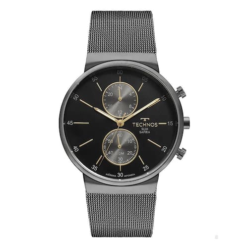 Com visual moderno e acabamento sofisticado, o relógio Technos VD36AC/1F é a escolha ideal para quem busca elegância com um toque contemporâneo. Sua caixa de 40mm em aço inox grafite abriga um mostrador preto com detalhes dourados e dois subdials funcionais que reforçam o estilo e a utilidade.
