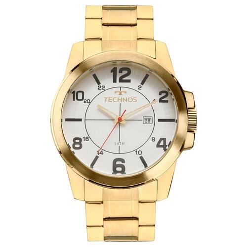 Sistema Analógico, Mostrador Branco com Detalhes em Dourado, Caixa de Aço e Pulseira de Aço, Vidro de Cristal Mineral, Resistente à Água 50M, Calendário.