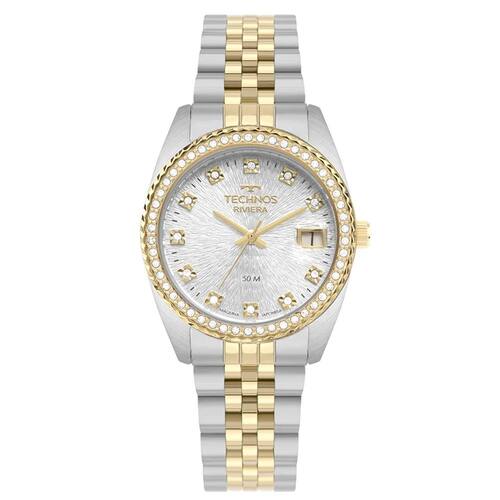 Relógio Technos Riviera 2117LFS/1K Bicolor Feminino O novo modelo da linha Riviera destaca-se pelo design clássico aliado a detalhes sofisticados. O aro externo com acabamento corrugado recebe aplicação de pedras, trazendo brilho e elegância ao pulso. O mostrador texturizado com marcadores tridimensionais de pedras adiciona profundidade, enquanto a assinatura da linha e a lupa de calendário completam a identidade da coleção. Além disso, o modelo apresenta resistência à água de 50 metros. Especificações Técnicas Mecanismo: Analógico Quartz Gênero: Feminino Visor: Prata Prova d'água: 50m Características: Caixa e pulseira em aço inoxidável Diâmetro da caixa: 33 mm : 1 ano pelo fabricante Technos Marca: Não Informado Ean: 7891530873294