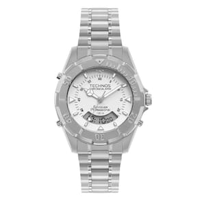 Relógio Technos Skydiver apresenta seu , de maquinismo anadigi com módulo exclusivo com 4 baterias, oferecendo maior durabilidade ao relógio, e com aro giratório unidirecional. Além disso, ele apresenta mostrador de fácil leitura com marcadores de hora luminescentes, além de cronógrafo e aro corrugado. Produto 100% em aço inoxidável, com pulseira de aço inoxidável em 3 links, com resistência à água de 150 metros.