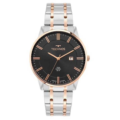 Relógio Technos Slim com uma nova caixa prata com aro rosé, de construção fina e sofisticada. Ele apresenta uma elegante pulseira de aço em 5 links, mostrador com design minimalista e assinatura de linha; e vidro de safira, que oferece alta resistência a riscos e arranhões. Produto 100% em aço inoxidável, com máquina quartz japonesa Miyota, calendário e resistência à água de 50 metros. Pulseira 100% em aço inoxidável bicolor prata e rosé.