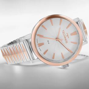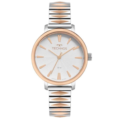 Garantia: 12 meses em toda rede autorizada TECHNOSConteúdo da embalagem: 1 relógio, manual, certificado de garantiaFornecedor: Technos Indústria e Comércio da Amazônia S/A Características: Vidro: Cristal MineralMaterial da caixa: AçoCor da caixa: RoséMaterial da pulseira: AçoCor da pulseira: PrataDiâmetro da caixa: 38 mmCor do mostrador: BrancoMecanismo: Quartz / Máquina JaponesaFunções: AnalógicoResistência à água : 5 atmRelógio Technos Style com design moderno, elegante pulseira de mola diferenciada, mostrador com aplicação de textura sutil e marcadores de hora no formato de pipa. Produto 100% em aço inoxidável em banho bicolor prata/rosé, com máquina quartz japonesa Miyota e resistência à água de 50m. Tamanho de caixa 38mm.